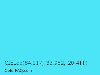 CIELab 84.117,-33.952,-20.411 Color is a light cyan color and the nearest color is Turquoise Blue #6cdae7. Hex code #4ce5f7 and RGB value is rgb(76,229,247). In RGB color space, this color is composed of 30% red, 90% green, 97% blue, In CMYK color space, this color is composed of 69% cyan, 7% magenta, 0% yellow , 3% black , In HSL color space, this color has a hue angle of 186° , 91% saturation and 63% lightness.