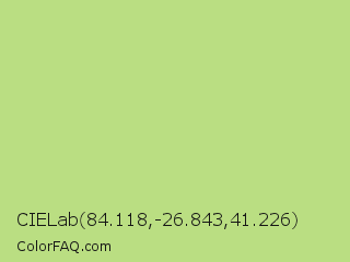 CIELab 84.118,-26.843,41.226 Color is a light green color and the nearest color is Yellow Green #c5e17a. Hex code #bade82 and RGB value is rgb(186,222,130). In RGB color space, this color is composed of 73% red, 87% green, 51% blue, In CMYK color space, this color is composed of 16% cyan, 0% magenta, 41% yellow , 13% black , In HSL color space, this color has a hue angle of 83° , 58% saturation and 69% lightness.