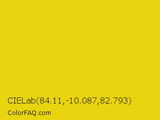 CIELab 84.11,-10.087,82.793 Color is a normal yellow color and the nearest color is Citrine #e4d00a. Hex code #e8d40f and RGB value is rgb(232,212,15). In RGB color space, this color is composed of 91% red, 83% green, 6% blue, In CMYK color space, this color is composed of 0% cyan, 9% magenta, 94% yellow , 9% black , In HSL color space, this color has a hue angle of 54° , 88% saturation and 48% lightness.