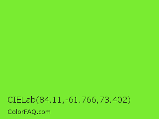 CIELab 84.11,-61.766,73.402 Color is a normal green color and the nearest color is Spring Frost #87ff2a. Hex code #79ec31 and RGB value is rgb(121,236,49). In RGB color space, this color is composed of 47% red, 93% green, 19% blue, In CMYK color space, this color is composed of 49% cyan, 0% magenta, 79% yellow , 7% black , In HSL color space, this color has a hue angle of 97° , 83% saturation and 56% lightness.