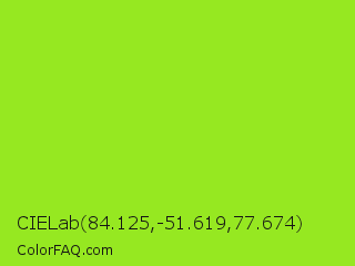 CIELab 84.125,-51.619,77.674 Color is a normal green color and the nearest color is Green Lizard #a7f432. Hex code #96e821 and RGB value is rgb(150,232,33). In RGB color space, this color is composed of 59% red, 91% green, 13% blue, In CMYK color space, this color is composed of 35% cyan, 0% magenta, 86% yellow , 9% black , In HSL color space, this color has a hue angle of 85° , 81% saturation and 52% lightness.