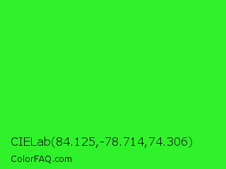 CIELab 84.125,-78.714,74.306 Color is a normal green color and the nearest color is Neon Green #39ff14. Hex code #30f22b and RGB value is rgb(48,242,43). In RGB color space, this color is composed of 19% red, 95% green, 17% blue, In CMYK color space, this color is composed of 80% cyan, 0% magenta, 82% yellow , 5% black , In HSL color space, this color has a hue angle of 118° , 88% saturation and 56% lightness.
