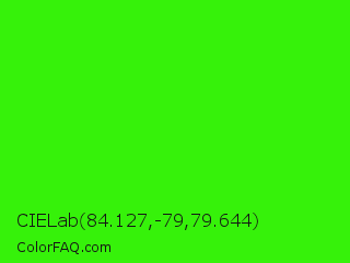 CIELab 84.127,-79,79.644 Color is a normal green color and the nearest color is Neon Green #39ff14. Hex code #36f20a and RGB value is rgb(54,242,10). In RGB color space, this color is composed of 21% red, 95% green, 4% blue, In CMYK color space, this color is composed of 78% cyan, 0% magenta, 96% yellow , 5% black , In HSL color space, this color has a hue angle of 109° , 92% saturation and 49% lightness.