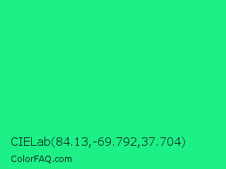 CIELab 84.13,-69.792,37.704 Color is a normal green color and the nearest color is Spring Green #00ff7f. Hex code #1cf087 and RGB value is rgb(28,240,135). In RGB color space, this color is composed of 11% red, 94% green, 53% blue, In CMYK color space, this color is composed of 88% cyan, 0% magenta, 44% yellow , 6% black , In HSL color space, this color has a hue angle of 150° , 88% saturation and 53% lightness.