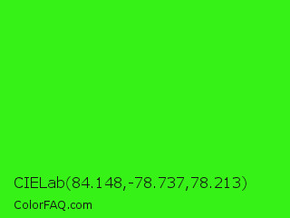 CIELab 84.148,-78.737,78.213 Color is a normal green color and the nearest color is Neon Green #39ff14. Hex code #36f217 and RGB value is rgb(54,242,23). In RGB color space, this color is composed of 21% red, 95% green, 9% blue, In CMYK color space, this color is composed of 78% cyan, 0% magenta, 90% yellow , 5% black , In HSL color space, this color has a hue angle of 112° , 89% saturation and 52% lightness.
