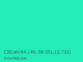 CIELab 84.149,-58.351,12.732 Color is a normal cyan color and the nearest color is Turquoise PWG #30d5c8. Hex code #21edb8 and RGB value is rgb(33,237,184). In RGB color space, this color is composed of 13% red, 93% green, 72% blue, In CMYK color space, this color is composed of 86% cyan, 0% magenta, 22% yellow , 7% black , In HSL color space, this color has a hue angle of 164° , 85% saturation and 53% lightness.