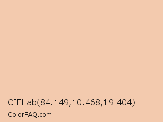 CIELab 84.149,10.468,19.404 Color is a very light orange color and the nearest color is Desert Sand #edc9af. Hex code #f3caae and RGB value is rgb(243,202,174). In RGB color space, this color is composed of 95% red, 79% green, 68% blue, In CMYK color space, this color is composed of 0% cyan, 17% magenta, 28% yellow , 5% black , In HSL color space, this color has a hue angle of 24° , 74% saturation and 82% lightness.