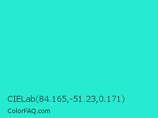 CIELab 84.165,-51.23,0.171 Color is a normal cyan color and the nearest color is Turquoise PWG #30d5c8. Hex code #26ebd0 and RGB value is rgb(38,235,208). In RGB color space, this color is composed of 15% red, 92% green, 82% blue, In CMYK color space, this color is composed of 84% cyan, 0% magenta, 11% yellow , 8% black , In HSL color space, this color has a hue angle of 172° , 83% saturation and 54% lightness.