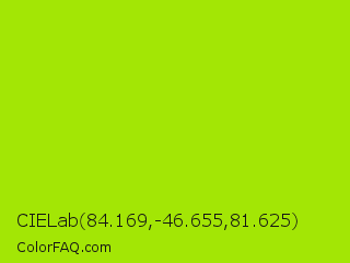 CIELab 84.169,-46.655,81.625 Color is a normal lime color and the nearest color is Vivid Lime Green #a6d608. Hex code #a3e605 and RGB value is rgb(163,230,5). In RGB color space, this color is composed of 64% red, 90% green, 2% blue, In CMYK color space, this color is composed of 29% cyan, 0% magenta, 98% yellow , 10% black , In HSL color space, this color has a hue angle of 78° , 96% saturation and 46% lightness.