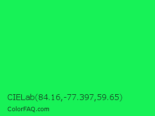 CIELab 84.16,-77.397,59.65 Color is a normal green color and the nearest color is Malachite #0bda51. Hex code #17f257 and RGB value is rgb(23,242,87). In RGB color space, this color is composed of 9% red, 95% green, 34% blue, In CMYK color space, this color is composed of 90% cyan, 0% magenta, 64% yellow , 5% black , In HSL color space, this color has a hue angle of 138° , 89% saturation and 52% lightness.