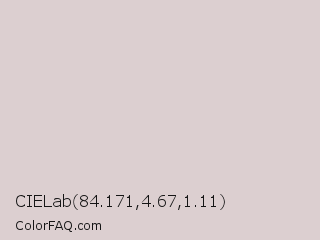 CIELab 84.171,4.67,1.11 Color is a very light red color and the nearest color is Timberwolf Crayola #d9d6cf. Hex code #dccfd0 and RGB value is rgb(220,207,208). In RGB color space, this color is composed of 86% red, 81% green, 82% blue, In CMYK color space, this color is composed of 0% cyan, 6% magenta, 5% yellow , 14% black , In HSL color space, this color has a hue angle of 355° , 16% saturation and 84% lightness.