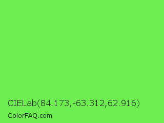 CIELab 84.173,-63.312,62.916 Color is a light green color and the nearest color is Screamin Green #66ff66. Hex code #6ded50 and RGB value is rgb(109,237,80). In RGB color space, this color is composed of 43% red, 93% green, 31% blue, In CMYK color space, this color is composed of 54% cyan, 0% magenta, 66% yellow , 7% black , In HSL color space, this color has a hue angle of 109° , 81% saturation and 62% lightness.