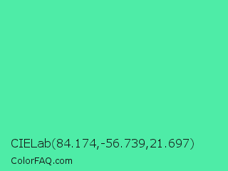CIELab 84.174,-56.739,21.697 Color is a light green color and the nearest color is Eucalyptus #44d7a8. Hex code #4eeca7 and RGB value is rgb(78,236,167). In RGB color space, this color is composed of 31% red, 93% green, 65% blue, In CMYK color space, this color is composed of 67% cyan, 0% magenta, 29% yellow , 7% black , In HSL color space, this color has a hue angle of 154° , 81% saturation and 62% lightness.