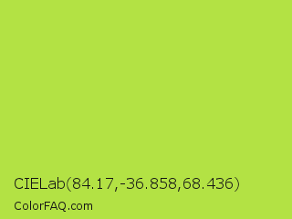 CIELab 84.17,-36.858,68.436 Color is a normal lime color and the nearest color is Conifer #acdd4d. Hex code #b3e244 and RGB value is rgb(179,226,68). In RGB color space, this color is composed of 70% red, 89% green, 27% blue, In CMYK color space, this color is composed of 21% cyan, 0% magenta, 70% yellow , 11% black , In HSL color space, this color has a hue angle of 78° , 73% saturation and 58% lightness.