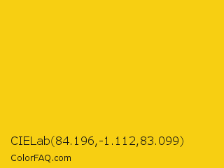 CIELab 84.196,-1.112,83.099 Color is a normal yellow color and the nearest color is Jonquil #f4ca16. Hex code #f7cf12 and RGB value is rgb(247,207,18). In RGB color space, this color is composed of 97% red, 81% green, 7% blue, In CMYK color space, this color is composed of 0% cyan, 16% magenta, 93% yellow , 3% black , In HSL color space, this color has a hue angle of 50° , 93% saturation and 52% lightness.