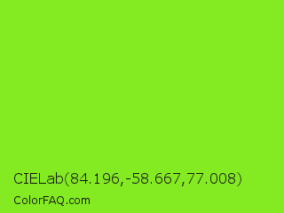 CIELab 84.196,-58.667,77.008 Color is a normal green color and the nearest color is Spring Frost #87ff2a. Hex code #84eb23 and RGB value is rgb(132,235,35). In RGB color space, this color is composed of 52% red, 92% green, 14% blue, In CMYK color space, this color is composed of 44% cyan, 0% magenta, 85% yellow , 8% black , In HSL color space, this color has a hue angle of 91° , 83% saturation and 53% lightness.