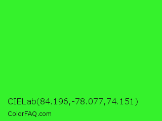 CIELab 84.196,-78.077,74.151 Color is a normal green color and the nearest color is Neon Green #39ff14. Hex code #35f22c and RGB value is rgb(53,242,44). In RGB color space, this color is composed of 21% red, 95% green, 17% blue, In CMYK color space, this color is composed of 78% cyan, 0% magenta, 82% yellow , 5% black , In HSL color space, this color has a hue angle of 117° , 88% saturation and 56% lightness.