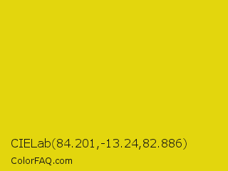 CIELab 84.201,-13.24,82.886 Color is a normal yellow color and the nearest color is Citrine #e4d00a. Hex code #e3d60d and RGB value is rgb(227,214,13). In RGB color space, this color is composed of 89% red, 84% green, 5% blue, In CMYK color space, this color is composed of 0% cyan, 6% magenta, 94% yellow , 11% black , In HSL color space, this color has a hue angle of 56° , 89% saturation and 47% lightness.