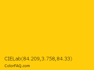 CIELab 84.209,3.758,84.33 Color is a normal yellow color and the nearest color is Mikado Yellow #ffc40c. Hex code #ffcc0a and RGB value is rgb(255,204,10). In RGB color space, this color is composed of 100% red, 80% green, 4% blue, In CMYK color space, this color is composed of 0% cyan, 20% magenta, 96% yellow , 0% black , In HSL color space, this color has a hue angle of 48° , 100% saturation and 52% lightness.