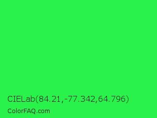 CIELab 84.21,-77.342,64.796 Color is a normal green color and the nearest color is Malachite #0bda51. Hex code #29f24a and RGB value is rgb(41,242,74). In RGB color space, this color is composed of 16% red, 95% green, 29% blue, In CMYK color space, this color is composed of 83% cyan, 0% magenta, 69% yellow , 5% black , In HSL color space, this color has a hue angle of 130° , 89% saturation and 55% lightness.