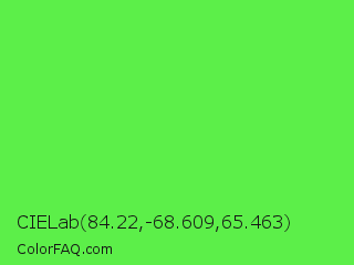 CIELab 84.22,-68.609,65.463 Color is a light green color and the nearest color is Screamin Green #66ff66. Hex code #5cef49 and RGB value is rgb(92,239,73). In RGB color space, this color is composed of 36% red, 94% green, 29% blue, In CMYK color space, this color is composed of 62% cyan, 0% magenta, 69% yellow , 6% black , In HSL color space, this color has a hue angle of 113° , 84% saturation and 61% lightness.