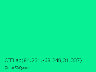 CIELab 84.231,-68.248,31.337 Color is a normal green color and the nearest color is Medium Spring Green #00fa9a. Hex code #08f094 and RGB value is rgb(8,240,148). In RGB color space, this color is composed of 3% red, 94% green, 58% blue, In CMYK color space, this color is composed of 97% cyan, 0% magenta, 38% yellow , 6% black , In HSL color space, this color has a hue angle of 156° , 94% saturation and 49% lightness.