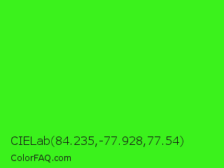 CIELab 84.235,-77.928,77.54 Color is a normal green color and the nearest color is Neon Green #39ff14. Hex code #3bf21c and RGB value is rgb(59,242,28). In RGB color space, this color is composed of 23% red, 95% green, 11% blue, In CMYK color space, this color is composed of 76% cyan, 0% magenta, 88% yellow , 5% black , In HSL color space, this color has a hue angle of 111° , 89% saturation and 53% lightness.