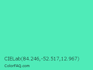 CIELab 84.246,-52.517,12.967 Color is a light green color and the nearest color is Eucalyptus #44d7a8. Hex code #4febb8 and RGB value is rgb(79,235,184). In RGB color space, this color is composed of 31% red, 92% green, 72% blue, In CMYK color space, this color is composed of 66% cyan, 0% magenta, 22% yellow , 8% black , In HSL color space, this color has a hue angle of 160° , 80% saturation and 62% lightness.