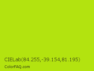 CIELab 84.255,-39.154,81.195 Color is a normal lime color and the nearest color is Inch Worm #b0e313. Hex code #b3e30f and RGB value is rgb(179,227,15). In RGB color space, this color is composed of 70% red, 89% green, 6% blue, In CMYK color space, this color is composed of 21% cyan, 0% magenta, 93% yellow , 11% black , In HSL color space, this color has a hue angle of 74° , 88% saturation and 47% lightness.