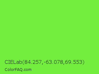 CIELab 84.257,-63.078,69.553 Color is a normal green color and the nearest color is Kiwi #8ee53f. Hex code #73ed3e and RGB value is rgb(115,237,62). In RGB color space, this color is composed of 45% red, 93% green, 24% blue, In CMYK color space, this color is composed of 51% cyan, 0% magenta, 74% yellow , 7% black , In HSL color space, this color has a hue angle of 102° , 83% saturation and 59% lightness.