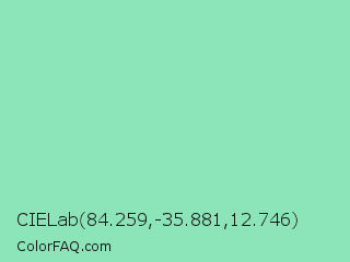 CIELab 84.259,-35.881,12.746 Color is a light green color and the nearest color is Algae Green #93dfb8. Hex code #8ce4b9 and RGB value is rgb(140,228,185). In RGB color space, this color is composed of 55% red, 89% green, 73% blue, In CMYK color space, this color is composed of 39% cyan, 0% magenta, 19% yellow , 11% black , In HSL color space, this color has a hue angle of 151° , 62% saturation and 72% lightness.