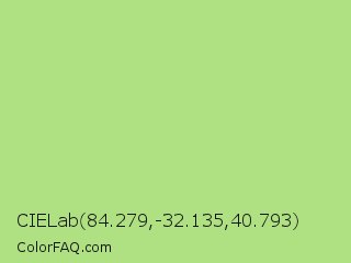 CIELab 84.279,-32.135,40.793 Color is a light green color and the nearest color is Feijoa #9fdd8c. Hex code #afe183 and RGB value is rgb(175,225,131). In RGB color space, this color is composed of 69% red, 88% green, 51% blue, In CMYK color space, this color is composed of 22% cyan, 0% magenta, 42% yellow , 12% black , In HSL color space, this color has a hue angle of 92° , 61% saturation and 70% lightness.