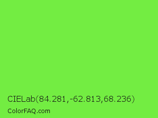 CIELab 84.281,-62.813,68.236 Color is a normal green color and the nearest color is Kiwi #8ee53f. Hex code #73ed42 and RGB value is rgb(115,237,66). In RGB color space, this color is composed of 45% red, 93% green, 26% blue, In CMYK color space, this color is composed of 51% cyan, 0% magenta, 72% yellow , 7% black , In HSL color space, this color has a hue angle of 103° , 83% saturation and 59% lightness.