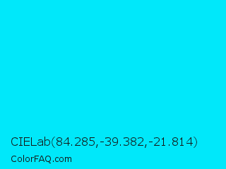 CIELab 84.285,-39.382,-21.814 Color is a normal cyan color and the nearest color is Loeen #15f2fd. Hex code #00e8fa and RGB value is rgb(0,232,250). In RGB color space, this color is composed of 0% red, 91% green, 98% blue, In CMYK color space, this color is composed of 100% cyan, 7% magenta, 0% yellow , 2% black , In HSL color space, this color has a hue angle of 184° , 100% saturation and 49% lightness.
