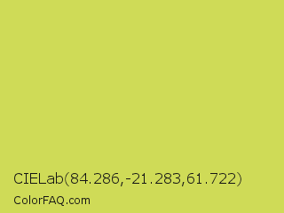 CIELab 84.286,-21.283,61.722 Color is a normal yellow color and the nearest color is Maximum Green Yellow #d9e650. Hex code #cfdb57 and RGB value is rgb(207,219,87). In RGB color space, this color is composed of 81% red, 86% green, 34% blue, In CMYK color space, this color is composed of 5% cyan, 0% magenta, 60% yellow , 14% black , In HSL color space, this color has a hue angle of 65° , 65% saturation and 60% lightness.