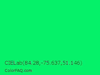 CIELab 84.28,-75.637,51.146 Color is a normal green color and the nearest color is Spring Green #00ff7f. Hex code #06f26b and RGB value is rgb(6,242,107). In RGB color space, this color is composed of 2% red, 95% green, 42% blue, In CMYK color space, this color is composed of 98% cyan, 0% magenta, 56% yellow , 5% black , In HSL color space, this color has a hue angle of 146° , 95% saturation and 49% lightness.