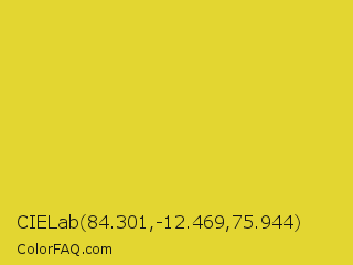 CIELab 84.301,-12.469,75.944 Color is a normal yellow color and the nearest color is Golden Dream #f0d52d. Hex code #e3d631 and RGB value is rgb(227,214,49). In RGB color space, this color is composed of 89% red, 84% green, 19% blue, In CMYK color space, this color is composed of 0% cyan, 6% magenta, 78% yellow , 11% black , In HSL color space, this color has a hue angle of 56° , 76% saturation and 54% lightness.