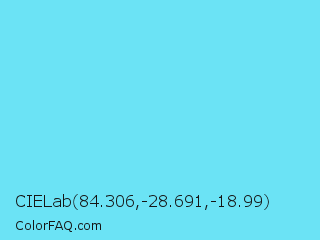 CIELab 84.306,-28.691,-18.99 Color is a light cyan color and the nearest color is Turquoise Blue #6cdae7. Hex code #6be3f5 and RGB value is rgb(107,227,245). In RGB color space, this color is composed of 42% red, 89% green, 96% blue, In CMYK color space, this color is composed of 56% cyan, 7% magenta, 0% yellow , 4% black , In HSL color space, this color has a hue angle of 188° , 87% saturation and 69% lightness.