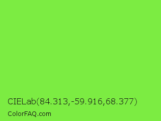 CIELab 84.313,-59.916,68.377 Color is a normal green color and the nearest color is Kiwi #8ee53f. Hex code #7cec42 and RGB value is rgb(124,236,66). In RGB color space, this color is composed of 49% red, 93% green, 26% blue, In CMYK color space, this color is composed of 47% cyan, 0% magenta, 72% yellow , 7% black , In HSL color space, this color has a hue angle of 100° , 82% saturation and 59% lightness.