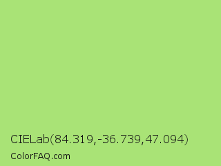 CIELab 84.319,-36.739,47.094 Color is a light green color and the nearest color is Feijoa #9fdd8c. Hex code #a9e376 and RGB value is rgb(169,227,118). In RGB color space, this color is composed of 66% red, 89% green, 46% blue, In CMYK color space, this color is composed of 26% cyan, 0% magenta, 48% yellow , 11% black , In HSL color space, this color has a hue angle of 92° , 66% saturation and 68% lightness.