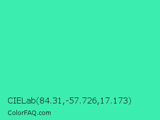 CIELab 84.31,-57.726,17.173 Color is a normal green color and the nearest color is Eucalyptus #44d7a8. Hex code #3cedb0 and RGB value is rgb(60,237,176). In RGB color space, this color is composed of 24% red, 93% green, 69% blue, In CMYK color space, this color is composed of 75% cyan, 0% magenta, 26% yellow , 7% black , In HSL color space, this color has a hue angle of 159° , 83% saturation and 58% lightness.