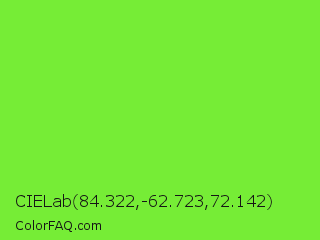 CIELab 84.322,-62.723,72.142 Color is a normal green color and the nearest color is Kiwi #8ee53f. Hex code #76ed36 and RGB value is rgb(118,237,54). In RGB color space, this color is composed of 46% red, 93% green, 21% blue, In CMYK color space, this color is composed of 50% cyan, 0% magenta, 77% yellow , 7% black , In HSL color space, this color has a hue angle of 99° , 84% saturation and 57% lightness.
