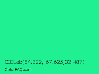 CIELab 84.322,-67.625,32.487 Color is a normal green color and the nearest color is Medium Spring Green #00fa9a. Hex code #1ff092 and RGB value is rgb(31,240,146). In RGB color space, this color is composed of 12% red, 94% green, 57% blue, In CMYK color space, this color is composed of 87% cyan, 0% magenta, 39% yellow , 6% black , In HSL color space, this color has a hue angle of 153° , 87% saturation and 53% lightness.