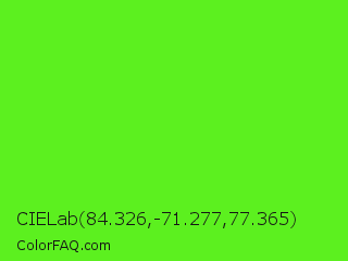 CIELab 84.326,-71.277,77.365 Color is a normal green color and the nearest color is Bright Green #66ff00. Hex code #5cf01f and RGB value is rgb(92,240,31). In RGB color space, this color is composed of 36% red, 94% green, 12% blue, In CMYK color space, this color is composed of 62% cyan, 0% magenta, 87% yellow , 6% black , In HSL color space, this color has a hue angle of 102° , 87% saturation and 53% lightness.