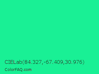 CIELab 84.327,-67.409,30.976 Color is a normal green color and the nearest color is Medium Spring Green #00fa9a. Hex code #19f095 and RGB value is rgb(25,240,149). In RGB color space, this color is composed of 10% red, 94% green, 58% blue, In CMYK color space, this color is composed of 90% cyan, 0% magenta, 38% yellow , 6% black , In HSL color space, this color has a hue angle of 155° , 88% saturation and 52% lightness.
