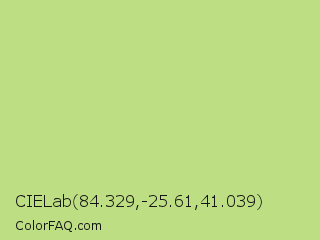 CIELab 84.329,-25.61,41.039 Color is a light green color and the nearest color is Yellow Green #c5e17a. Hex code #bdde83 and RGB value is rgb(189,222,131). In RGB color space, this color is composed of 74% red, 87% green, 51% blue, In CMYK color space, this color is composed of 15% cyan, 0% magenta, 41% yellow , 13% black , In HSL color space, this color has a hue angle of 82° , 58% saturation and 69% lightness.