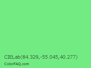 CIELab 84.329,-55.045,40.277 Color is a light green color and the nearest color is Very Light Malachite Green #64e986. Hex code #73eb83 and RGB value is rgb(115,235,131). In RGB color space, this color is composed of 45% red, 92% green, 51% blue, In CMYK color space, this color is composed of 51% cyan, 0% magenta, 44% yellow , 8% black , In HSL color space, this color has a hue angle of 128° , 75% saturation and 69% lightness.