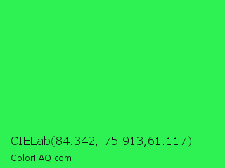 CIELab 84.342,-75.913,61.117 Color is a normal green color and the nearest color is Malachite #0bda51. Hex code #2ef254 and RGB value is rgb(46,242,84). In RGB color space, this color is composed of 18% red, 95% green, 33% blue, In CMYK color space, this color is composed of 81% cyan, 0% magenta, 65% yellow , 5% black , In HSL color space, this color has a hue angle of 132° , 88% saturation and 56% lightness.