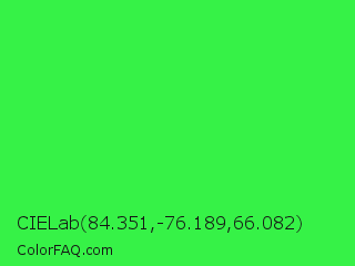 CIELab 84.351,-76.189,66.082 Color is a normal green color and the nearest color is Lime Green #32cd32. Hex code #36f247 and RGB value is rgb(54,242,71). In RGB color space, this color is composed of 21% red, 95% green, 28% blue, In CMYK color space, this color is composed of 78% cyan, 0% magenta, 71% yellow , 5% black , In HSL color space, this color has a hue angle of 125° , 88% saturation and 58% lightness.