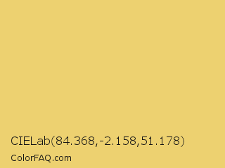 CIELab 84.368,-2.158,51.178 Color is a light yellow color and the nearest color is Hansa Yellow #e9d66b. Hex code #edd170 and RGB value is rgb(237,209,112). In RGB color space, this color is composed of 93% red, 82% green, 44% blue, In CMYK color space, this color is composed of 0% cyan, 12% magenta, 53% yellow , 7% black , In HSL color space, this color has a hue angle of 47° , 78% saturation and 68% lightness.